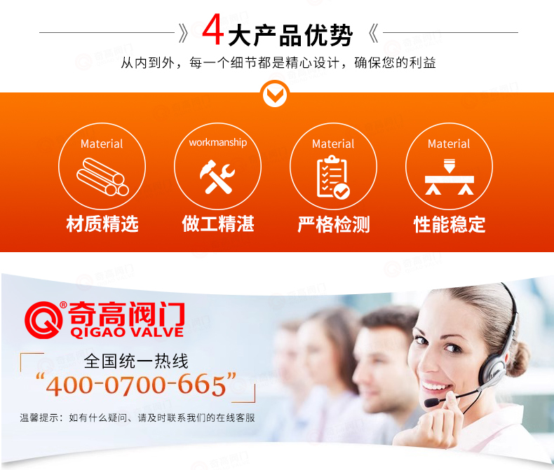 “奇高閥門(mén)”的期望,不斷提升服務(wù)質(zhì)量,精益求精,“真誠(chéng)的服務(wù)”是“奇高”永恒的主題?!捌娓摺眹?yán)格按照IS09001-2000 質(zhì)量體系認(rèn)證要求,質(zhì)量嚴(yán)格把關(guān), 責(zé)任到人,確保生產(chǎn)、銷(xiāo)售、服務(wù)的健康運(yùn)行。加強(qiáng)與用戶溝通,竭誠(chéng)為廣大客戶提供優(yōu)良產(chǎn)品,貼心服務(wù)。特此我廠做出以下承諾: