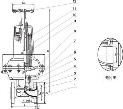 部件列表:1、閥體 2、閥體襯里 3、隔膜 4、閥瓣 5、下閥桿 6、閥蓋 7、氣缸 8、活塞 9、彈簧 10、氣缸蓋 11、上閥桿 12、手輪