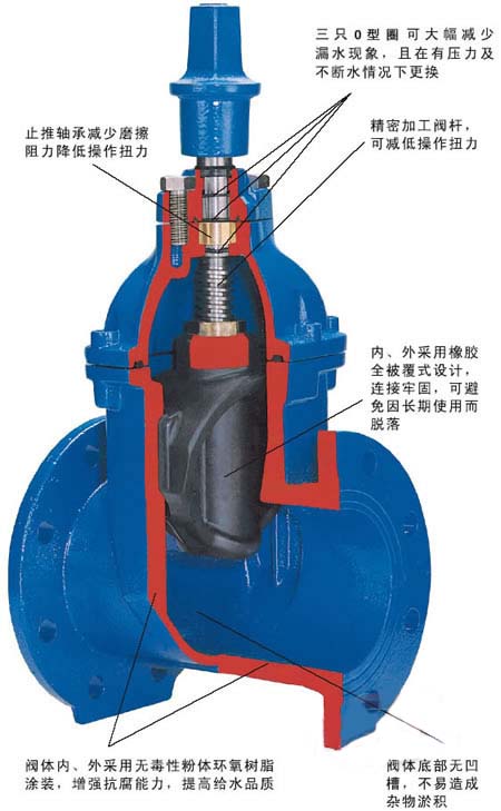 彈性座封閘閥也稱軟密封閘閥,彈性座封閘閥采用無(wú)凹腔結(jié)構(gòu),閥體閥蓋內(nèi)外表面噴涂環(huán)氧樹脂,閘板表面包覆橡膠,這樣從根本上杜絕了腐蝕發(fā)生的可能性,閥桿密封處舍棄填料而采用“O”形密封圈,使得蜜蜂更加可靠。根據(jù)需要,本閘閥可以采用操作桿、手輪、電動(dòng)及氣動(dòng)等方式操作。