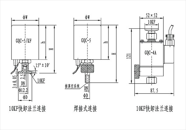 GQC-1.5 GQC-5型電磁高真空充氣閥是以電磁力為動(dòng)力,當(dāng)接通電源時(shí),閥門(mén)被關(guān)閉,使真空系統(tǒng)與大氣隔離;切斷電源時(shí),閥門(mén)處于開(kāi)啟狀態(tài),隨之大氣由外界引入真空系統(tǒng)。GQC-4A型電磁高真空充氣閥具有通電開(kāi)啟和通電關(guān)閉兩種功能,閥內(nèi)帶有空氣過(guò)濾器,可用作向真空系統(tǒng)充氣。