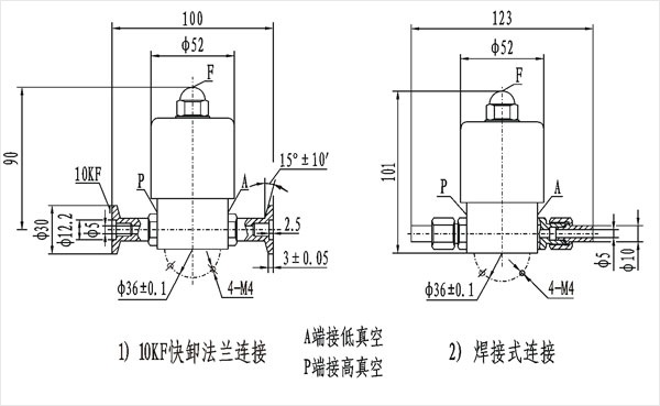 GDC-Q5型電磁高真空帶充氣閥連接在高低真空系統(tǒng)上,該閥通電閥板打開,同時封閉充氣口,將P、A端管路接通;斷電時閥板關閉,切斷P、A端管路,保證系統(tǒng)的真空度,同時打開充氣口,通過F端向A端充氣。